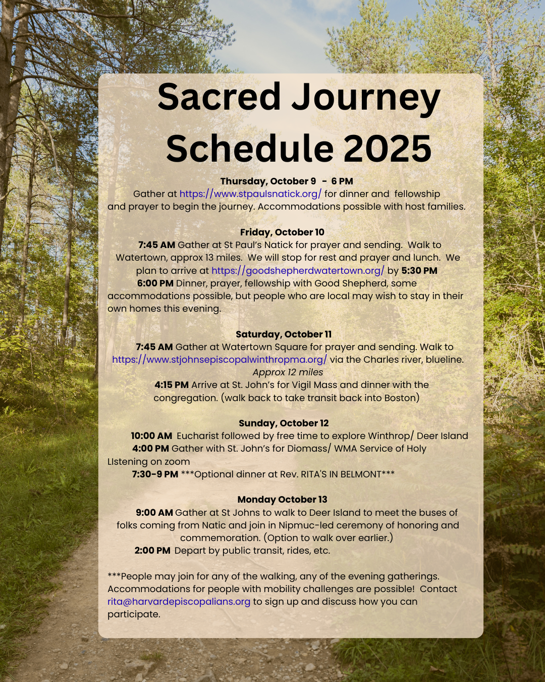 Over three years, Province I of the Episcopal church with various native, ecumenical, interfaith partners in each diocese will sponsor convening opportunities to walk and pray and be in silence and listening together. These events will be on each of the Indigenous People’s Day weekends of 2025, 2026, 2027, and Holy Week of 2028, commemorating the signing of the treaty that ended the active phase of the conflict. Other events may emerge. In each event, the intention is to have opportunities to gather, to walk, to listen.